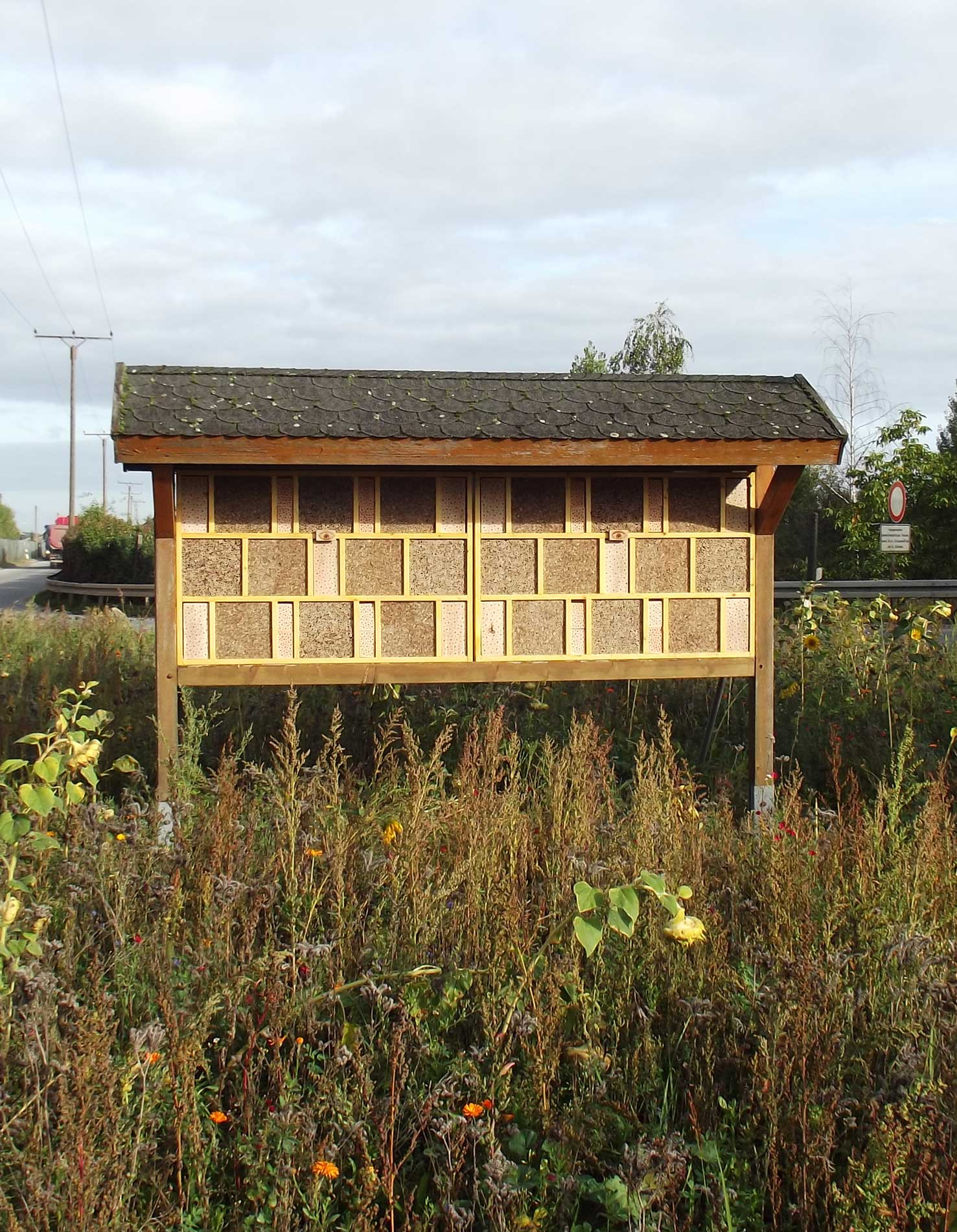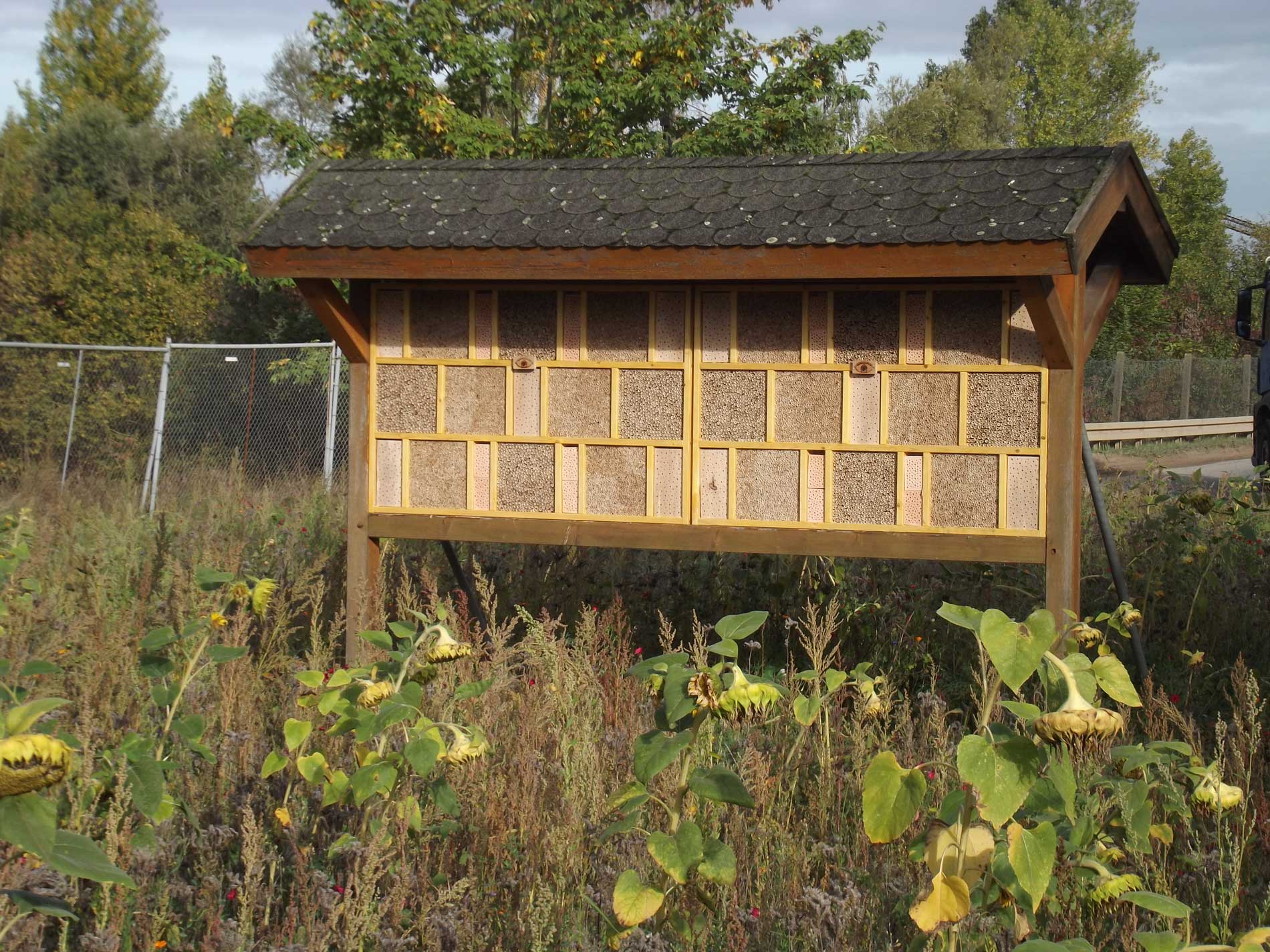 Eine Kiesbaggerei bei Wesel am Niederrhein wurde renaturiert. Hierzu wurde eine Blühfläche angelegt und eine Informationsstation, die über Kiesbaggereien informierte, als Insektenhotel umfunktioniert. Es wurden von uns zwei Kästen mit entsprechenden Füllungen für Wildbienen angefertigt, die in den vorhandenen Korpus integriert wurden.